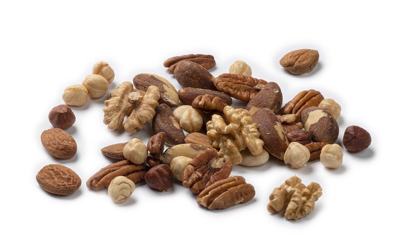Mix van ongebrande noten: Walnoten, Pecannoten, Blanke hazelnoten, Bruine hazelnoten, Blanke amandelen, Bruine amandelen, Paranoten