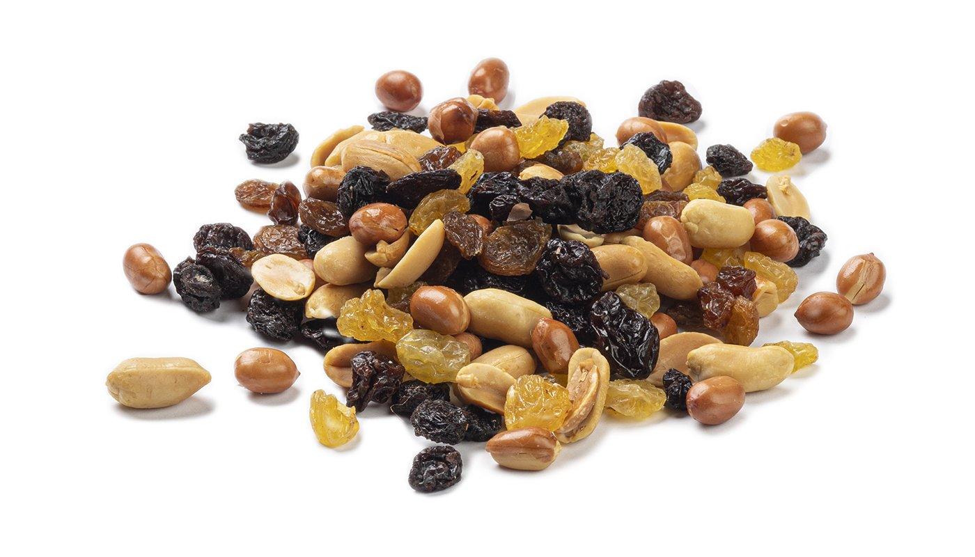 Mix van: Sultana-, Gele-, Blauwe Rozijnen, Ongezouten Jumbo pinda’s en Kleine Vliespinda’s